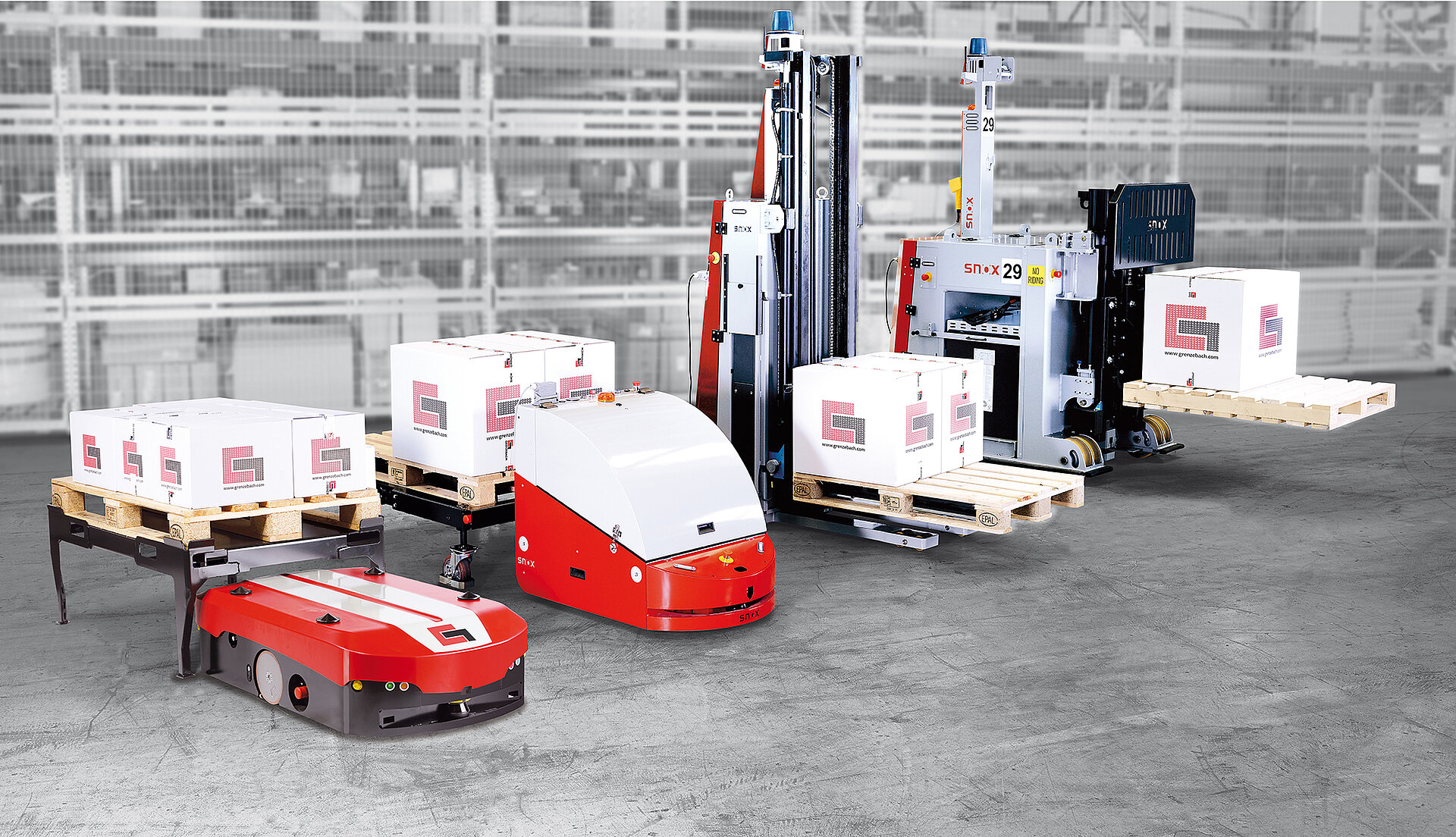Neben dem L1200S hat Grenzebach eine Flotte an Fahrerlosen Universalstaplern, die sogenannten Forklifts. Sie übernehmen die Aufgaben eines Gabelstaplers – ohne Fahrer, personensicher und mit funktionssicherer Navigation. Die Forklifts können Transportgewichte bis zu 4 Tonnen, je nach Ausführung automatisch aufnehmen, absetzen, transportieren – und das bei einer Hubhöhe bis zu 5 Metern.
