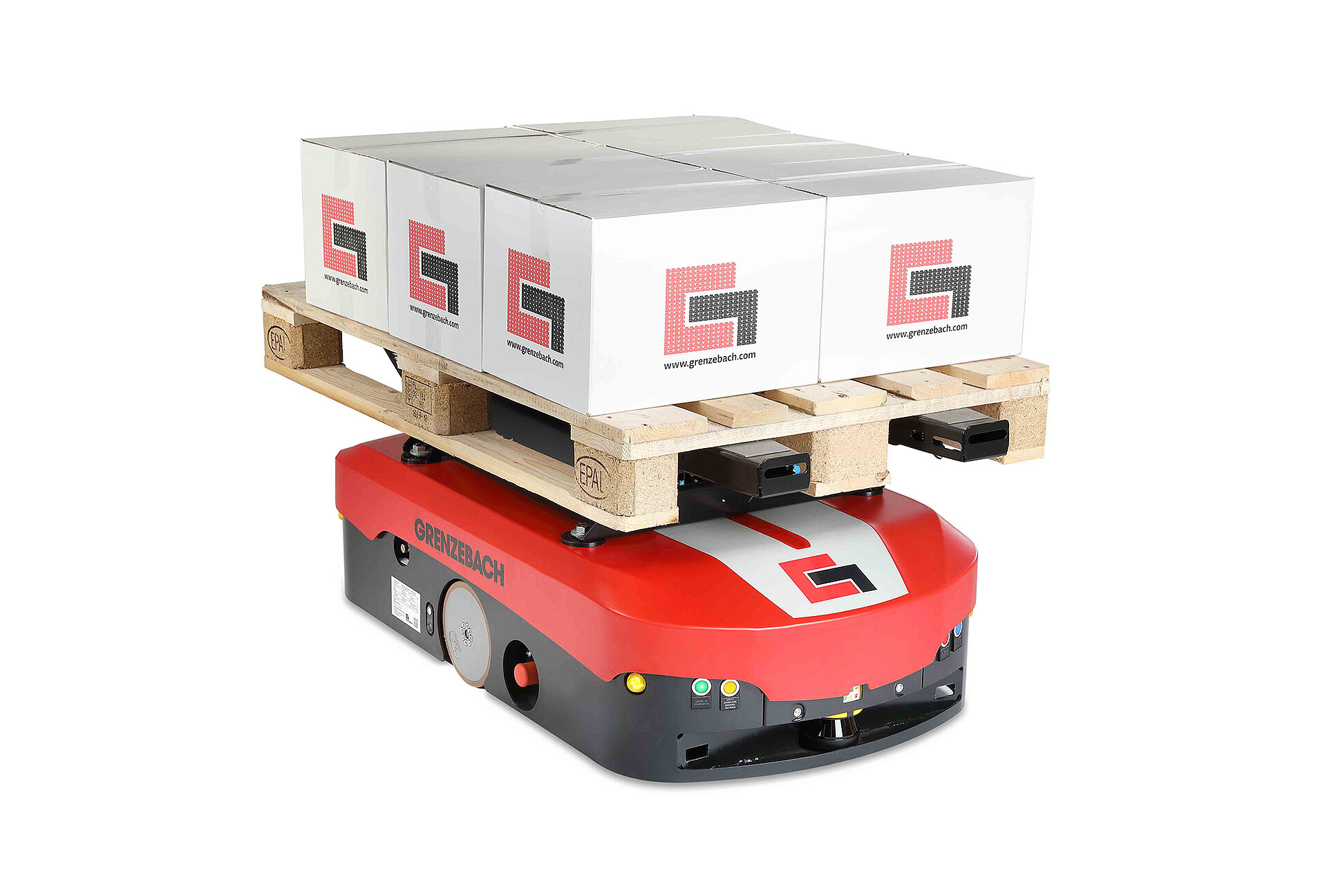 Mit dem Fahrerlosen Transportsystem (FTS) L1200S bringt Grenzebach seine Kunden auf die Pole Position. Das Fahrzeug transportiert Lasten bis zum Vierfachen des Eigengewichts – bis zu 1,2 Tonnen längs oder quer und kann zudem auf der Stelle drehen. Es ist komplett eigensicher, wofür unter anderem zwei Laserscanner sorgen. Die zertifizierte Sensorik für Personensicherheit ermöglicht den Einsatz der automatischen Fahrzeuge in allen betrieblichen Umgebungen, auch im Verkehr mit Personen und Flurförderfahrzeugen. Das macht die Implementierung einfacher, da keine abgetrennten Schutzbereiche eingerichtet werden müssen und weniger Platz benötigt wird. Dank der sehr niedrigen Bauhöhe kann das L1200S jeden Lastenträger (Tische, Trolleys, Gestelle, Regale) unterfahren, diesen anheben und zum vorgegebenen Zielort transportieren. Der Weg dahin wird vom Grenzebach Flottenmanager festgelegt. Das Antriebskonzept des L1200S basiert auf der von Grenzebach entwickelten Lastumverteilung.