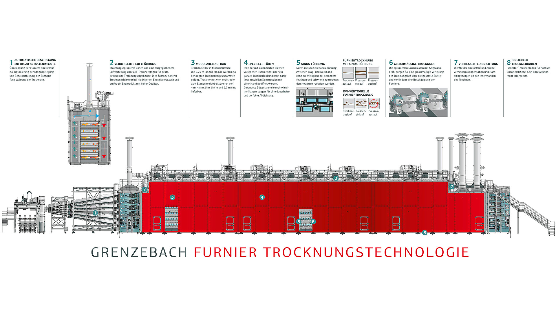 „Grenzebach - we do drying better”: Der Furniertrockner von Grenzebach ist modular aufgebaut und kann so optimal für die jeweiligen Verhältnisse vor Ort installiert werden. Die 2,25 Meter langen Module werden zur benötigten Trocknerlänge zusammengefügt. Lieferbar sind Trockner mit vier, sechs oder acht Etagen – mit folgenden Arbeitsbreiten: 4 Meter; 4,80 Meter; 5 Meter; 5,8 Meter; 6,2 Meter – auch Sonderbreiten sind möglich. Was den Zugang zum Trockner anbelangt: Jede der mit aluminierten Blechen versehenen Türen reicht über ein ganzes Trocknerfeld und kann dank ihrer speziellen Konstruktion mit einer Hand geöffnet werden. Gerundete Bögen zur Aufnahme der speziell entwickelten Türdichtungen anstelle rechtwinkliger Kanten sorgen für eine dauerhafte und perfekte Abdichtung. In welcher Größe und Ausstattung der Furniertrockner im Einzelfall auch installiert wird: Ein Spezialfundament ist nicht erforderlich, ein isolierter Trocknerboden ist für Grenzebach eine Selbstverständlichkeit – höchste Energieeffizienz immer im Blick.