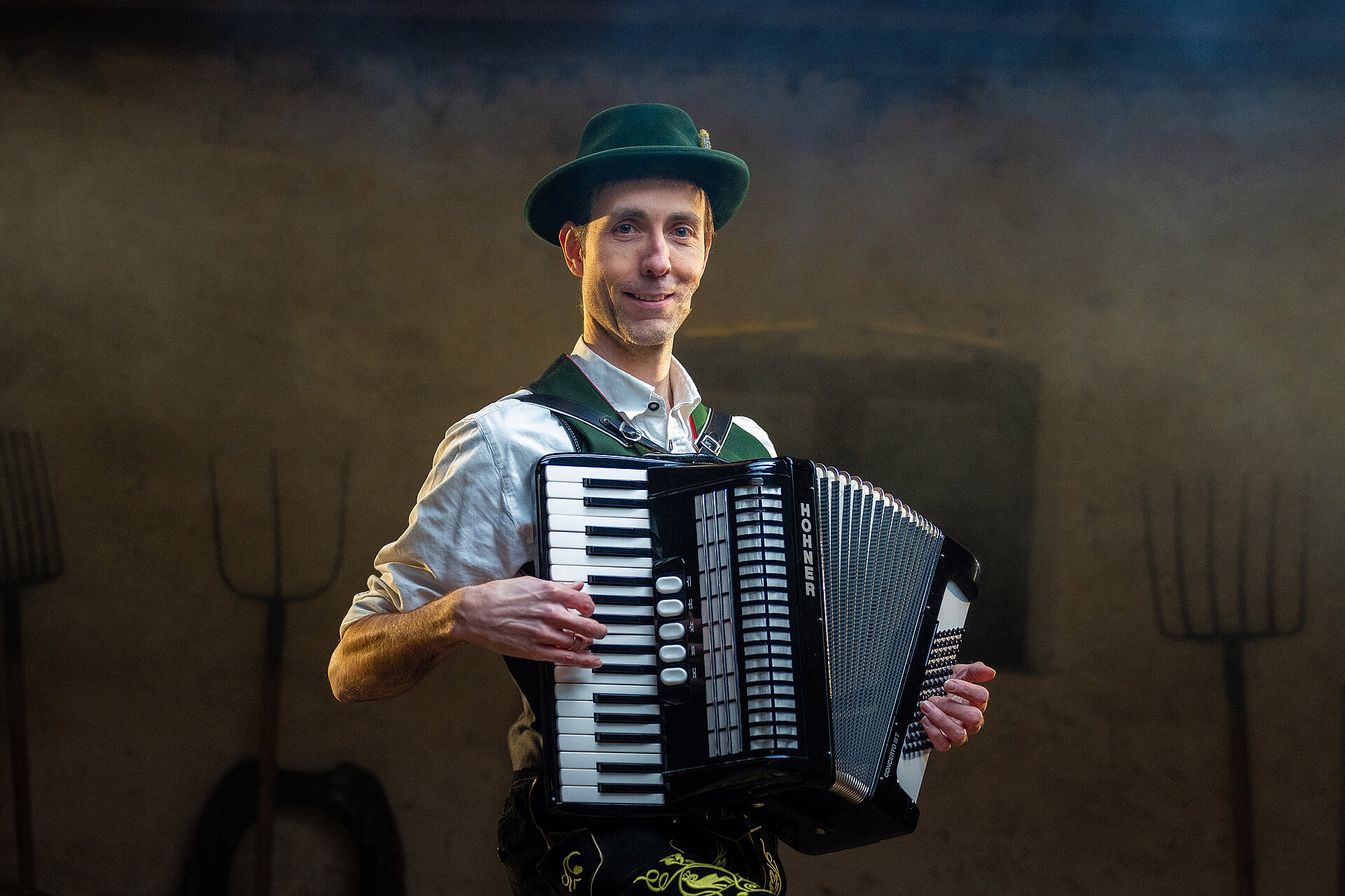 They wear Lederhosen, jump and walk in a circle synchronously, they clap their hands and slap their own upper legs, lower legs and shoe soles rhythmically with their hands. This is accompanied by Bavarian folk music played on an accordion in four-four time. The whole thing is called Schuhplatteln.